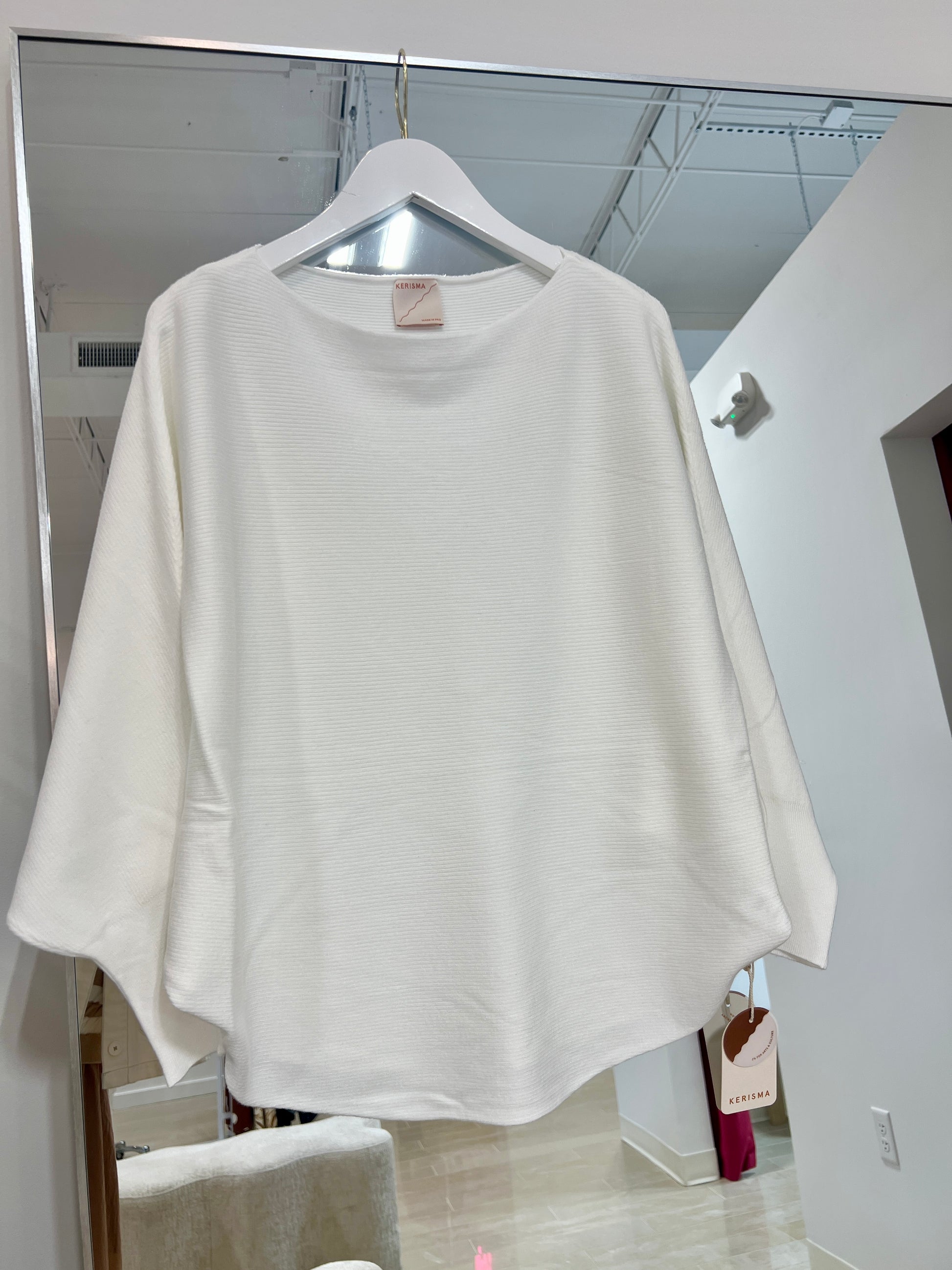Rib knit dolman sleeve boatneck sweater.